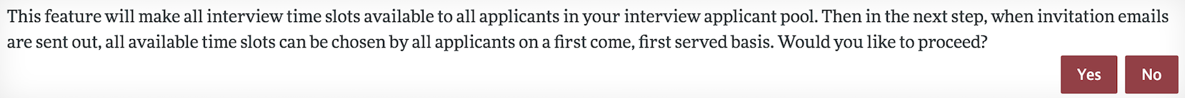 The system will (after you review and save changes) send an email letting the applicants know that they have been invited to select an interview time slot. Applicants will only see the time slots you choose to make available to them, and they will not see other applicants or their choices.