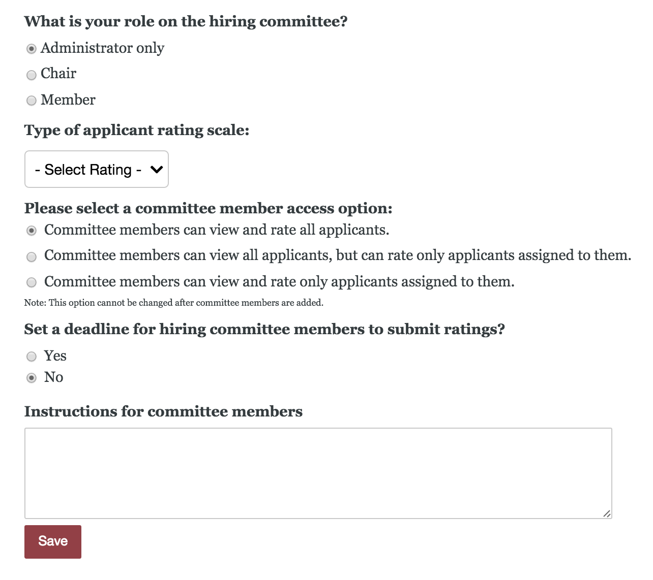 Create a hiring committee for your published listing from the employer dashboard. If desired, choose a type of applicant rating scale, whether all committee members will have access to all applicants, a deadline for submitting ratings, and further instructions.