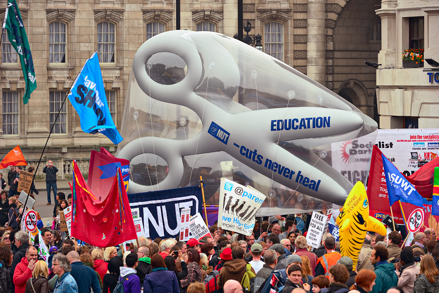 Protesters march past Trafalgar Square against public expenditure cuts in a rally organized by the Trades Union Congress in 2011.