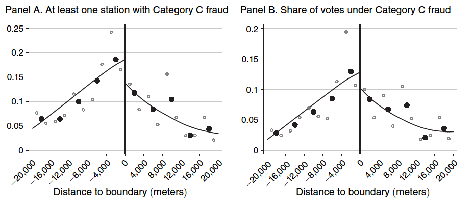 The share of fraudulent votes at polling centers that were just inside coverage areas dropped by about 4 percent, while the likelihood of a fraudulent station within a center went down by about 8 percent.