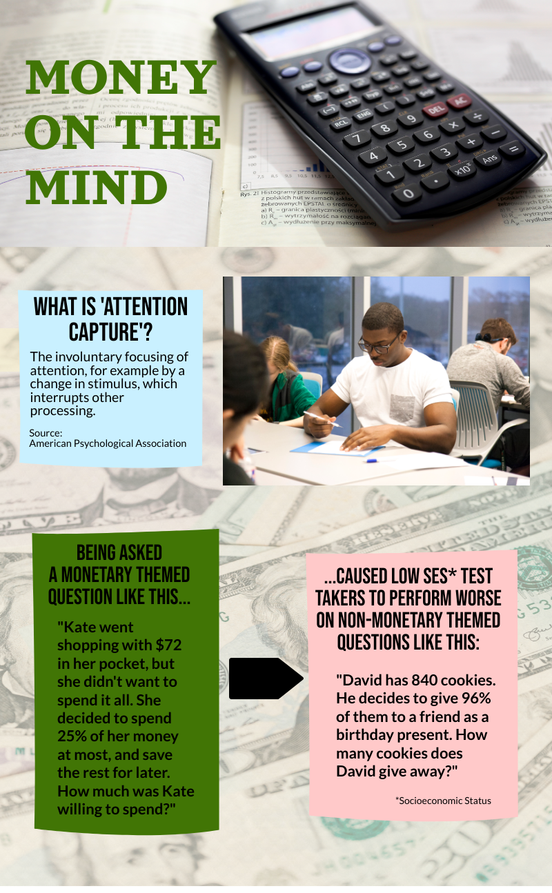 New research shows that monetary themed questions caused students from lower socioeconomic backgrounds to perform worse on standardized tests.