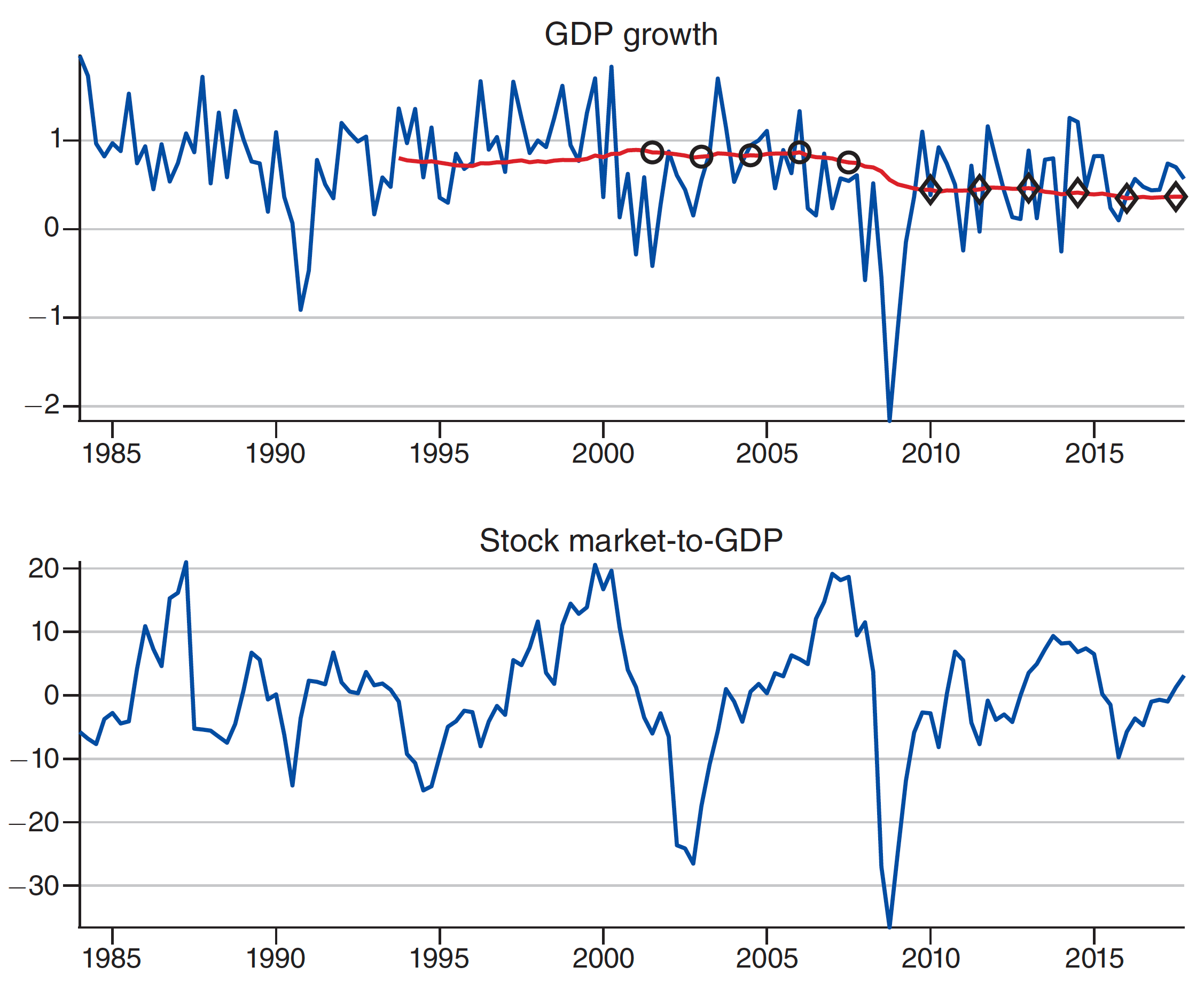The authors applied these modeling insights to US GDP and stock market data from 1984 to 2017. They were able to identify two prominent bubbles: one from 1997 to 2001, corresponding to the dot-com boom, and the other from 2006 to the onset of the Great Recession, corresponding to the housing bubble.