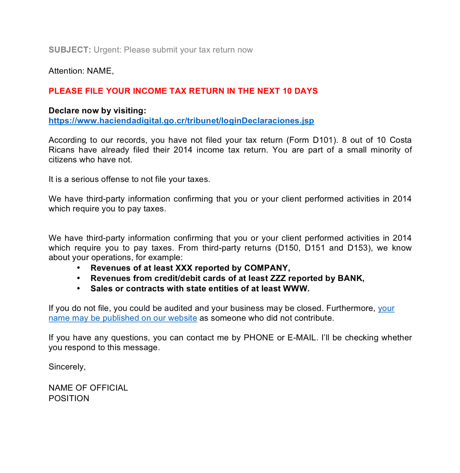 To test the most effective messaging strategy, the authors ran an experiment with the Costa Rican tax authority. They randomly sent reminder emails to roughly two-thirds of the country’s fifty thousand registered companies who hadn’t filed in 2014. The message included a general statement about the government’s knowledge of their business activities. The rest were used as controls that got nothing.