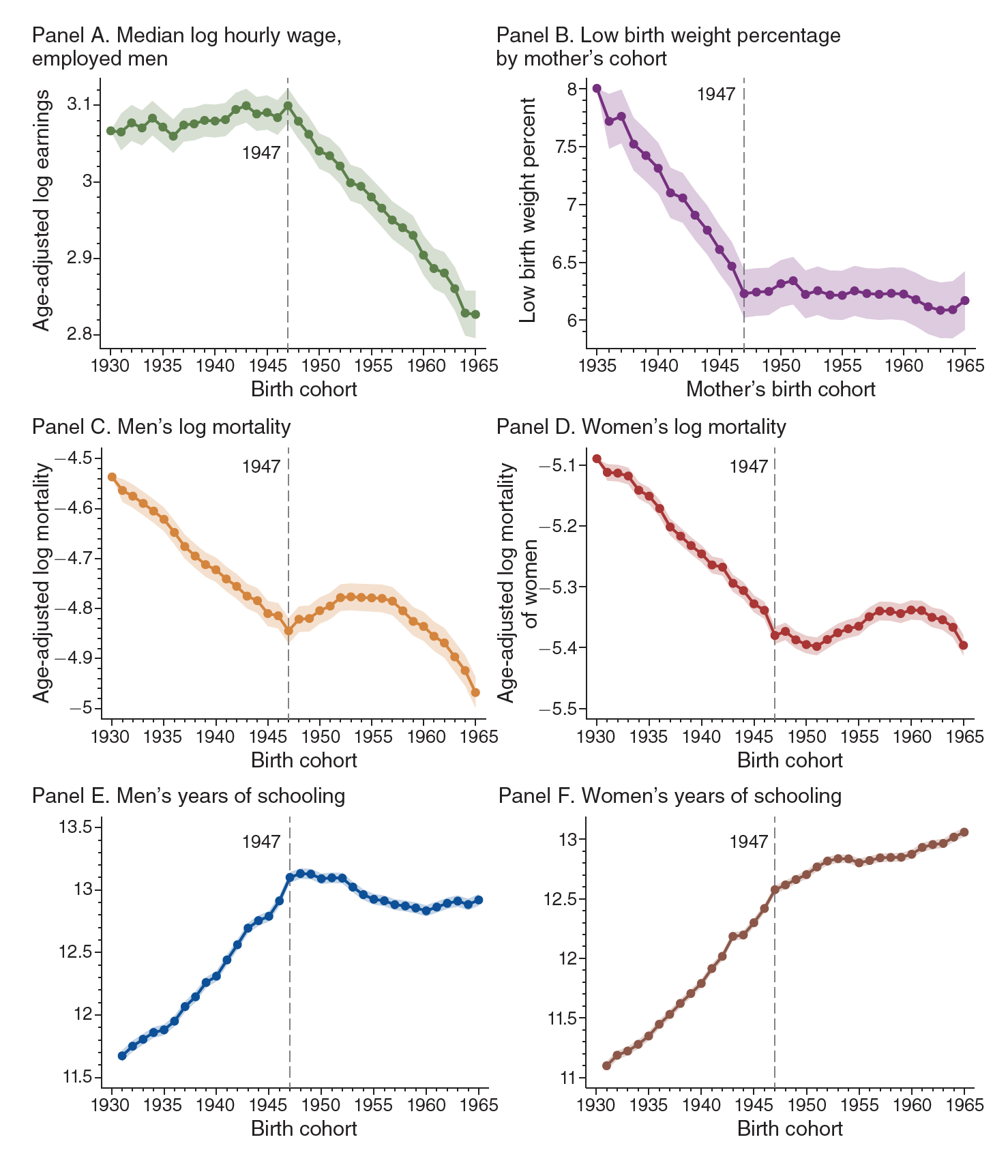 Reynolds drew his conclusions from government data on wages, birth weight, mortality, and schooling for hundreds of thousands of Americans. Figure 1 from his paper shows six series tracking key life outcomes for Americans born between 1930 and 1965.