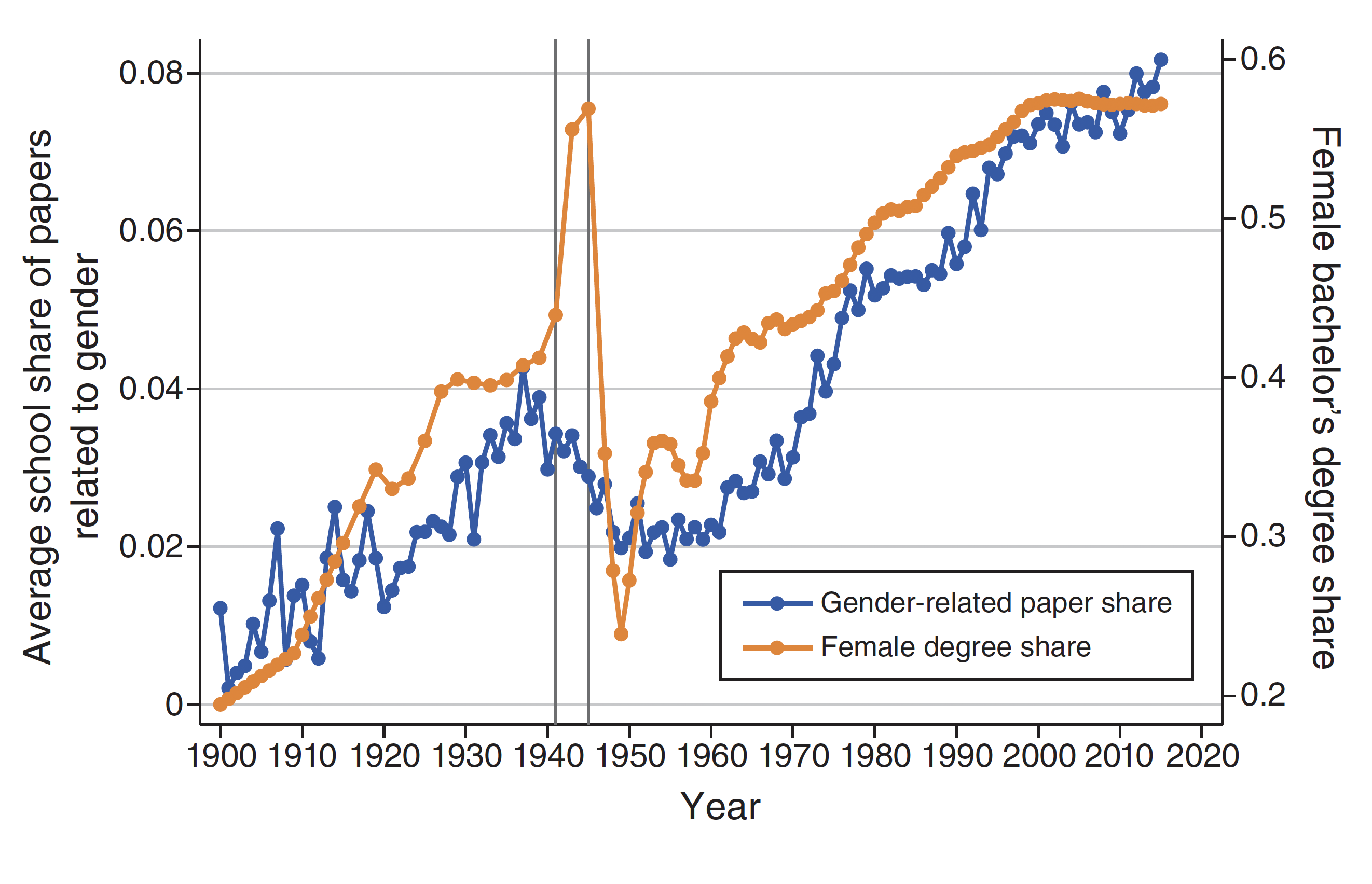 Figure 2 from the authors’ paper shows how gender-related research and undergraduate gender diversity moved together between 1900 and 2015.