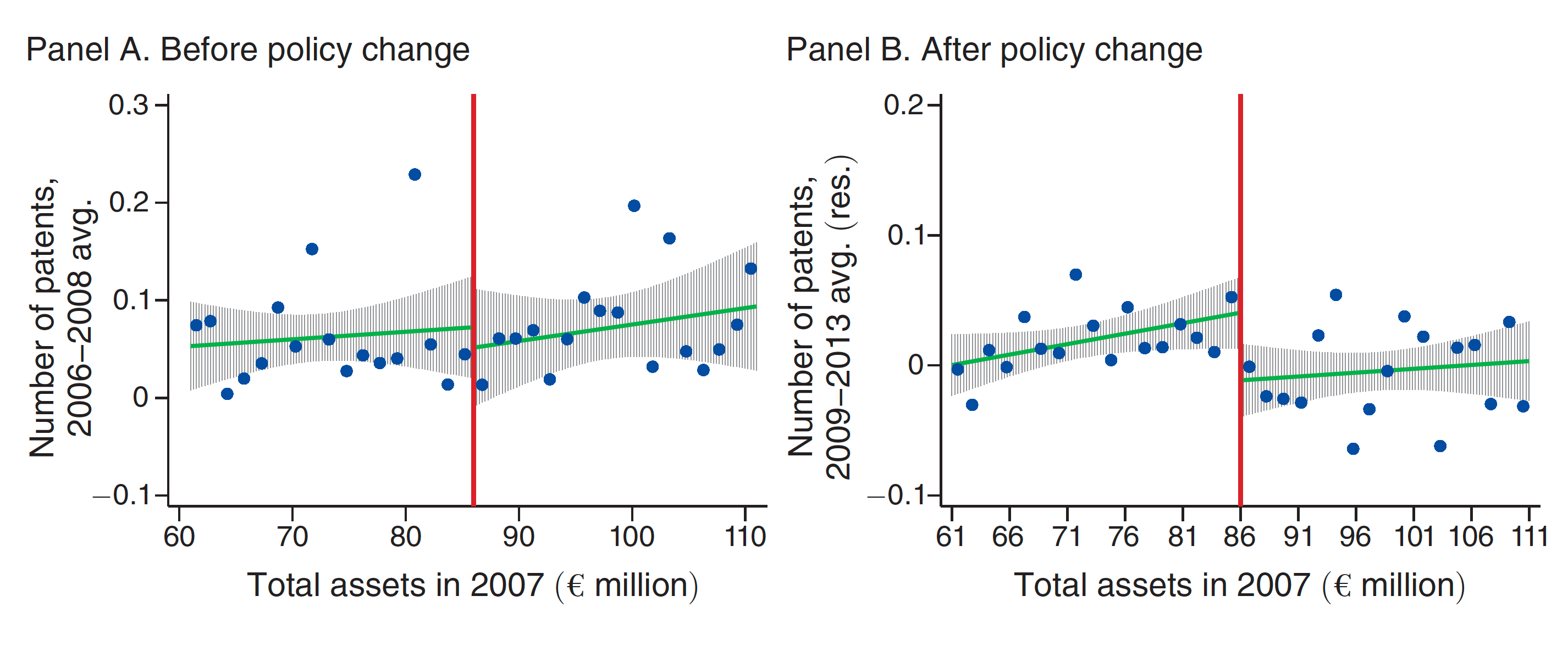 The chart shows that prior to 2008 there was no significant jump in patent filings at the €86 million threshold, indicated by the vertical red lines. But after the new policy went into effect, firms just below the threshold—which benefited from more generous tax breaks—filed significantly more patents than firms just above the threshold, roughly 5 percent more.
