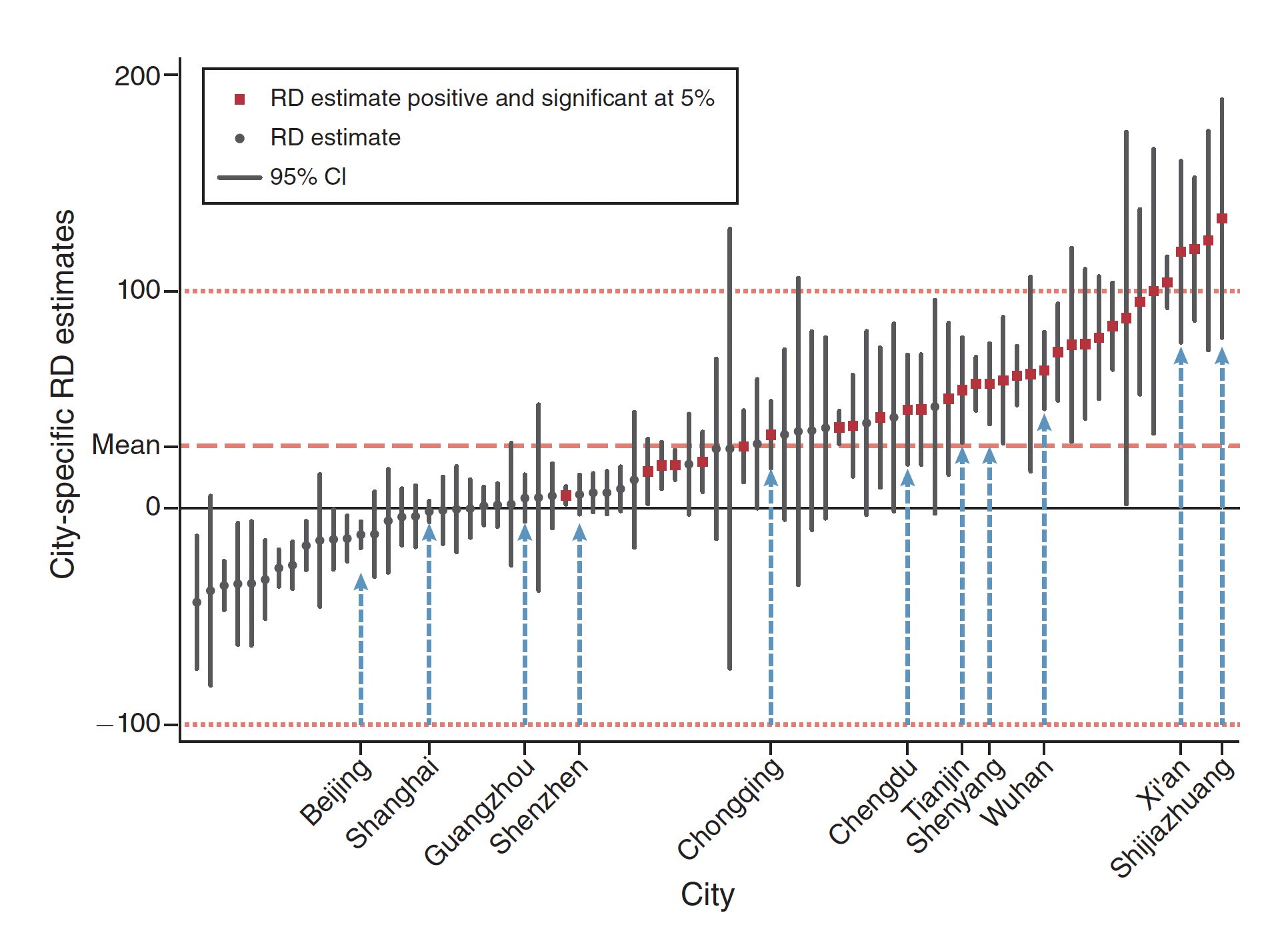 The y-axis indicates the average increase in reported PM₁₀, and the vertical bars show 95 percent confidence intervals. The estimates are positive for more than 70 percent of the cities. And among them, 33 estimates are positive and statistically significant (red squares).