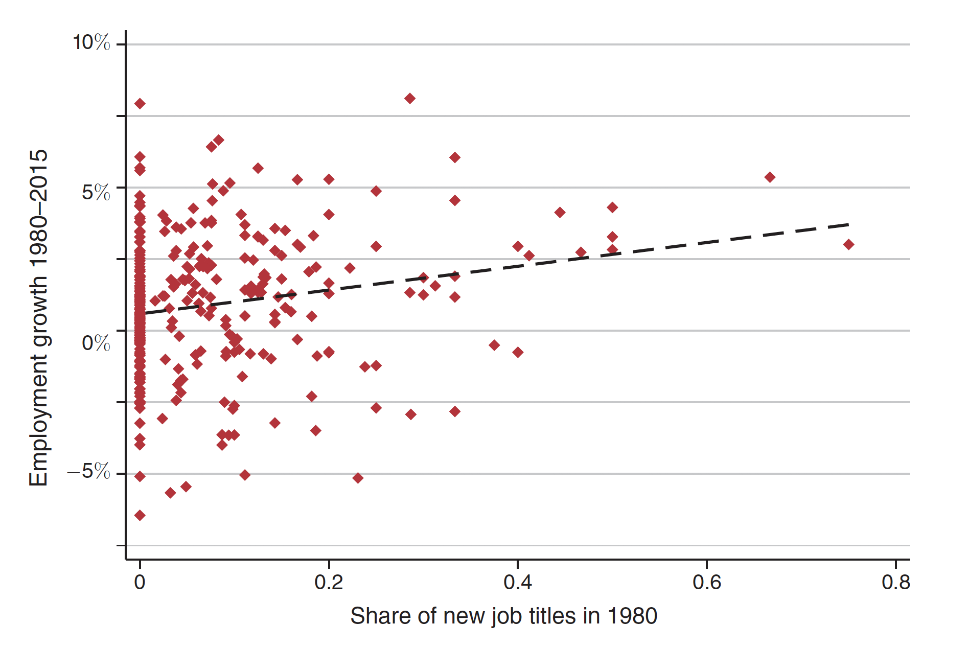 Figure 1 of their paper shows that occupations with more new job titles tended to see more employment growth from 1980 to 2015. Each red dot in the chart is an occupational category, which may contain many job titles. For example, at the far right of the chart, the occupation “management analyst” had nine different job titles in 1980, six of which were new. It then saw roughly 5 percent employment growth from 1980 to 2015.