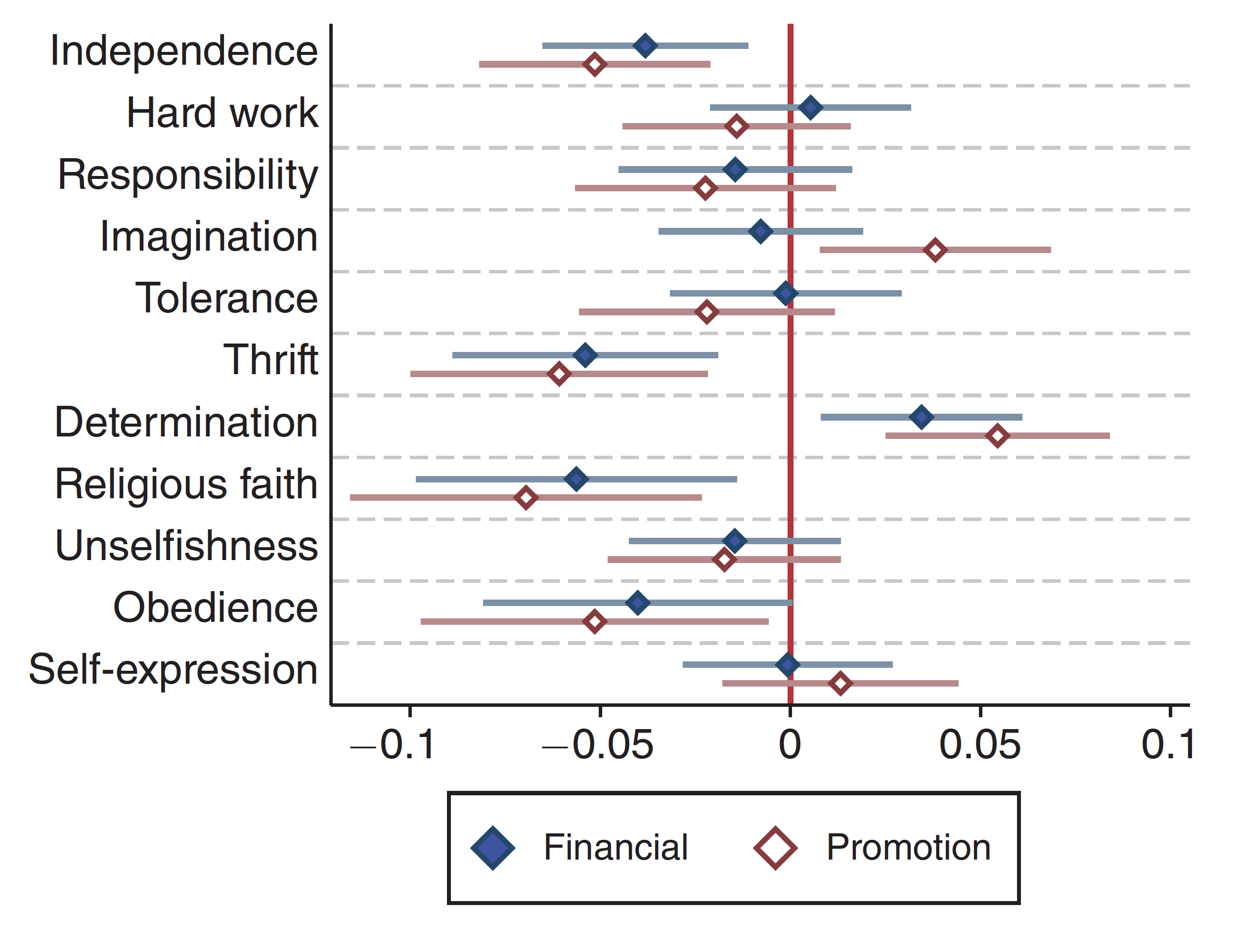 The x-axis indicates how much respondents’ performance score changed on average if they mentioned a certain value among their top five.