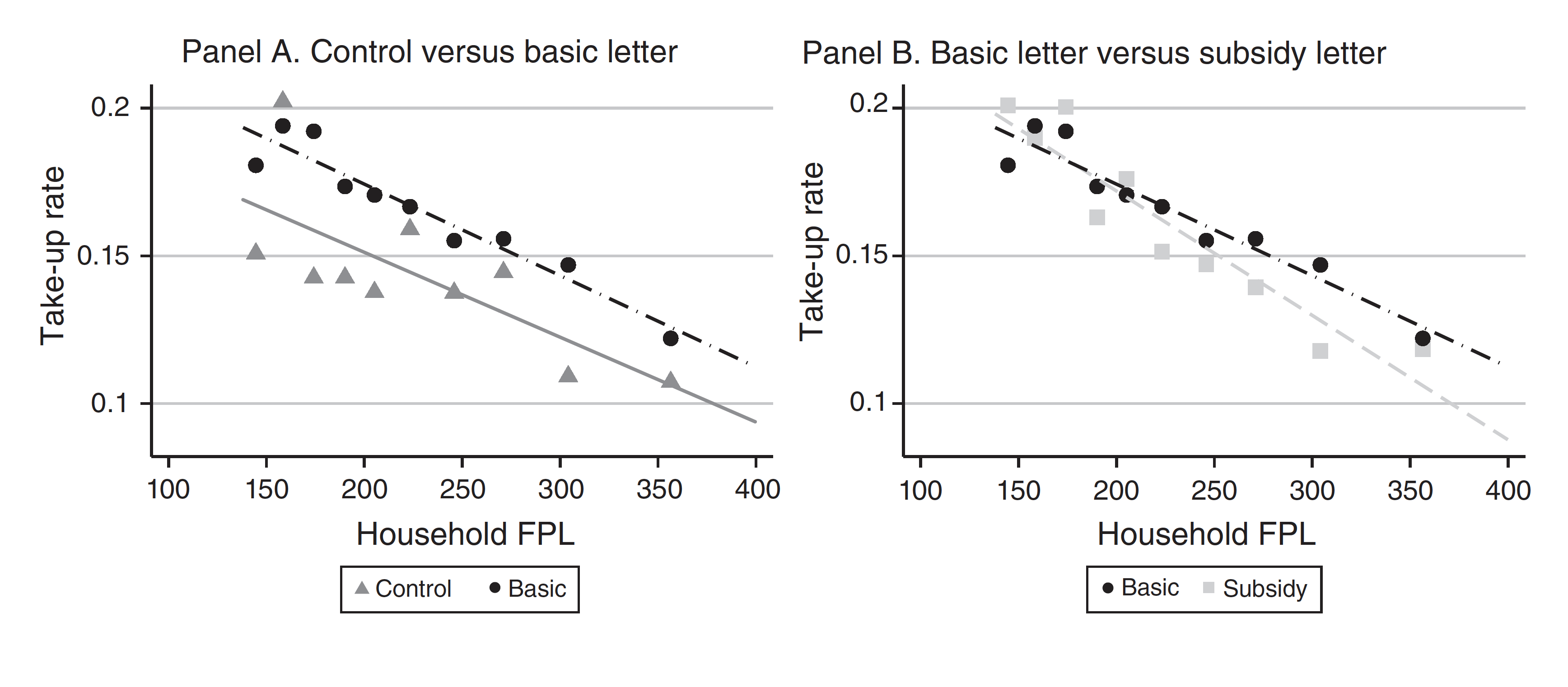 Panel A compares the control group (gray triangles), which didn’t receive any communications from the researchers, to the households that received a letter reminding them of the open enrollment deadline and basic details of the Covered California program (black circles).