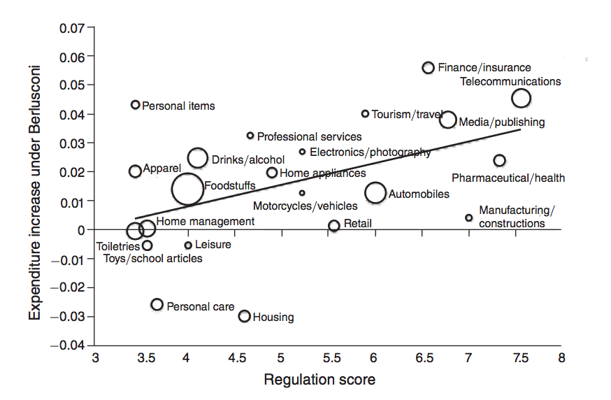 A paper in the American Economic Journal: Applied Economics that received a 2017 AEJ Best Paper Prize examined advertising spending in Italy during 1993-2009, a period in which Berlusconi was in power three separate times even as he controlled Italy’s major private television network, Mediaset. Figure 5 shows the changes in the share of television advertising spending for various sectors.