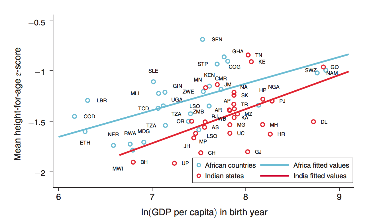 In Figure 1, the authors show how average heights in states in India (the red circles) compare to those in Sub-Saharan African countries (the blue circles), where child stunting also exists but there is not the same preference. The preference for the oldest son explains thirty-two percent of the gap between the two groups.