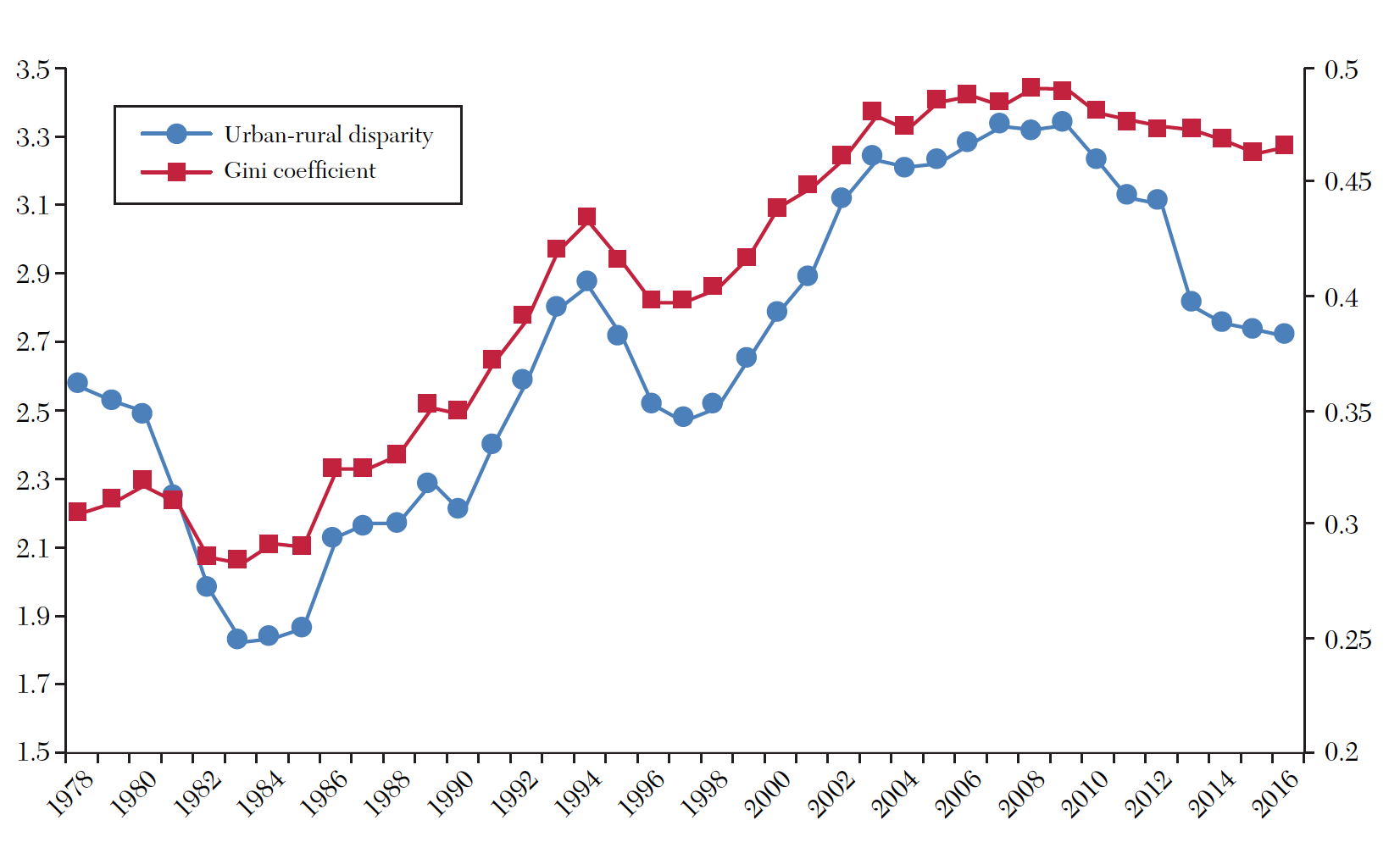 Figure 3 from Zhang’s paper shows how closely correlated urban and rural disparity (blue dotted line plotted along the left-axis) is to overall inequality in the country (red squares along right y-axis), since China implemented market-oriented reforms in 1978. Price reforms on agricultural products in the early 1980s helped to increase the income of rural households and thus reduced income disparity with city dwellers. But that trend was short-lived. The urban–rural divide began to grow once urban reforms—notably those related to manufacturing goods—were implemented in the mid-1980s. Urban–rural income disparity generally grew over the subsequent decades, peaking in 2009 when the per capita income in urban areas was three times higher than in rural regions.