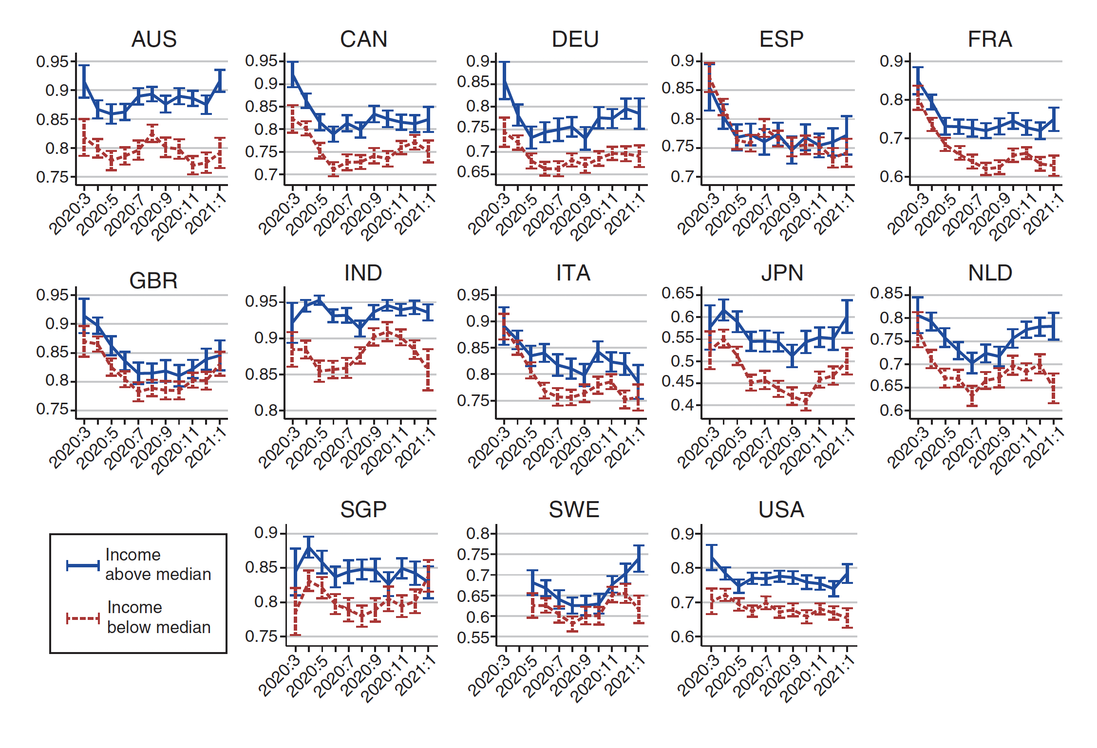 The x-axes mark the year and month. The y-axes represent the willingness to sacrifice rights, where higher values indicate greater willingness to make a sacrifice. The blue series show willingness for individuals above their nation’s median income, and the red series show the same measurement for individuals below their nation’s median income. The vertical lines are 95-percent confidence intervals.