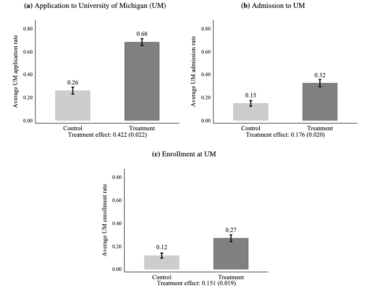 The figure above shows the main results from their study. The lightly shaded columns in each panel are the control group, which did not receive the offer letters, and the dark shaded column is the treatment group. (The black bars at the top of each column represent 95 percent confidence intervals.) At control schools, 26 percent of low-income, high-achieving students applied to the University of Michigan, compared to 68 percent at treatment schools (panel A). The large gap in application rate also carried over into admissions and enrollment. The rate of admission from the control schools was 15 percent and in treated schools was 32 percent. Finally, the enrollment rate for students in the control schools was 12 percent while in the treatment schools it was 27 percent.