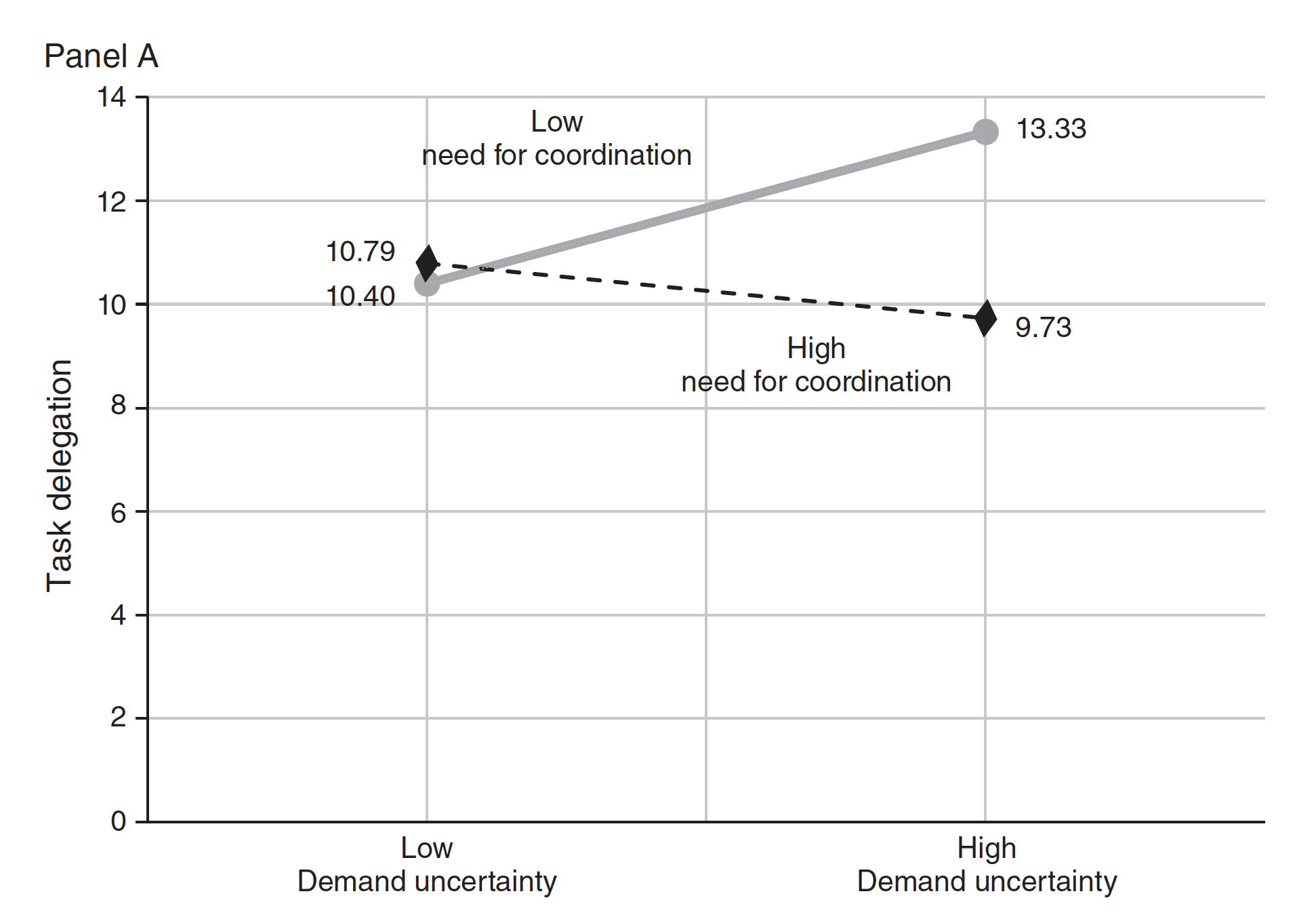 Panel A of Figure 3 from the authors’ paper illustrates their main finding on the interaction between the need for coordination within the company and the amount of department volatility.