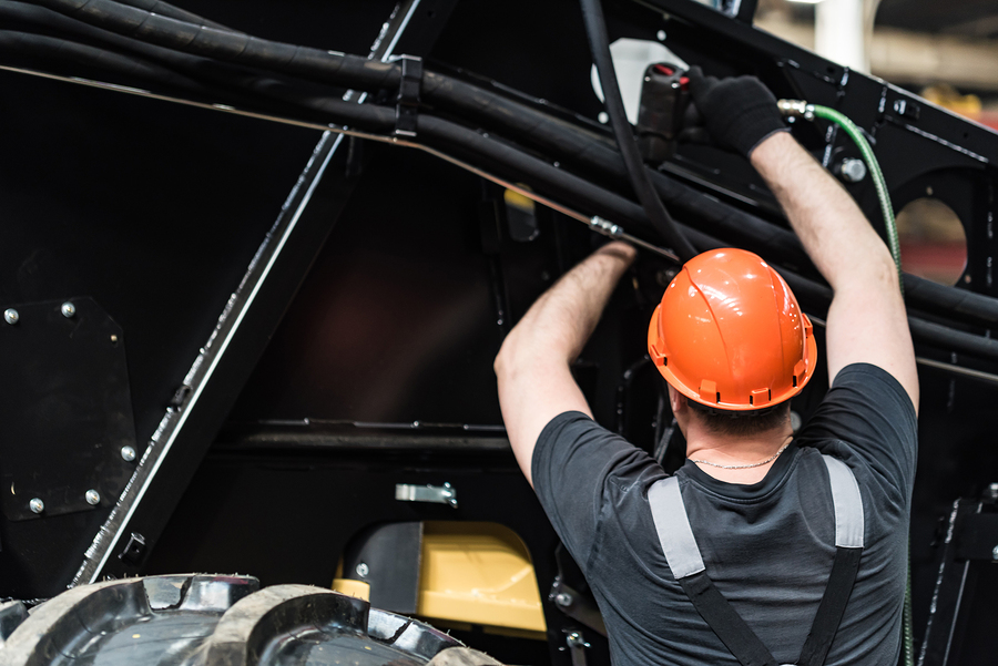 A worker assembles a tractor.