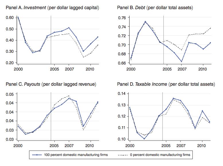 Figure 2 from his paper shows the estimated impacts of the reform. The solid blue line represents estimates for companies that can take full advantage of the tax break while the dotted line is for companies that receive no benefit from the tax break. Panels A and B show a sharp divergence in investment behavior after the law went into effect in 2005, and the gap grows wider as the tax break becomes more generous in later years. Investment grew while debt fell, suggesting that firms weren’t financing this ramp up in activity with new debt. The impact on payouts looks negligible, but the effect actually increased over time. This suggests that payouts respond only after the new investments incentivized by the deduction begin to generate income. The impact on taxable income was negligible.