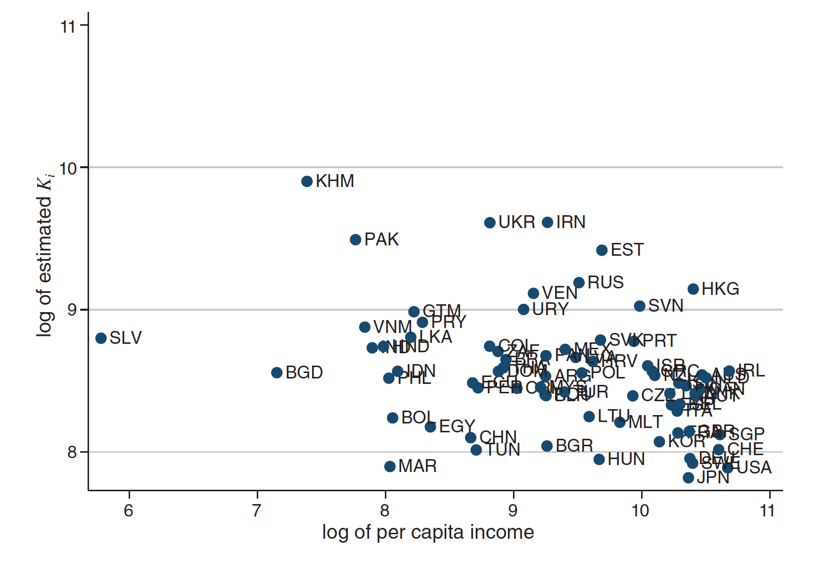 The figure above from their paper plots per shipment costs for exporting countries against their per capita GDP and shows a clear negative relationship between the two. Poorer countries like El Salvador (SLV), Cambodia (KHM), and Pakistan (PAK) have shipping costs (plotted along the y-axis) that are significantly higher than wealthy nations like the United States or Japan, which are among the lowest worldwide.