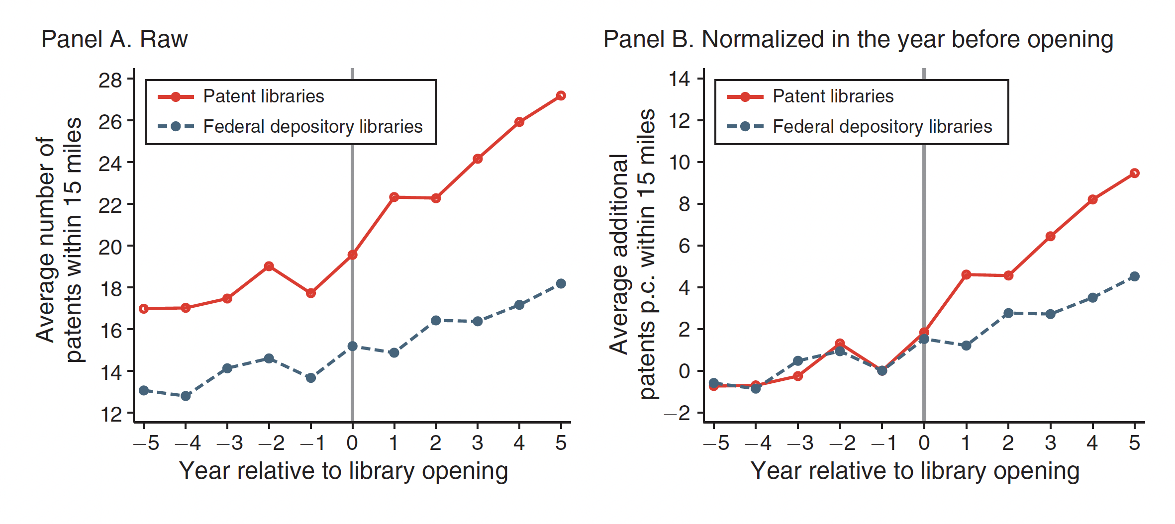The chart shows that in the five years before patent library openings, the average number of patents granted in areas with new patent libraries (red line) grew at about the same rate as those with only a federal depository library (dashed blue line). But after an opening, patents in areas with new patent libraries grew much faster.