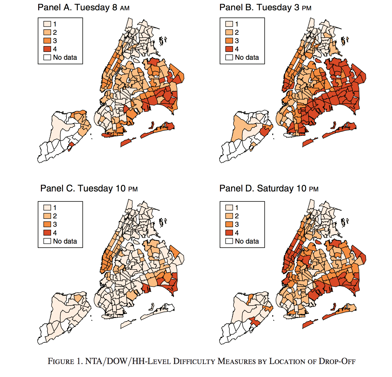 The authors find that the newest drivers do tend to earn significantly less after making dropoffs in more difficult neighborhoods or during less profitable times of day, presumably because they have not yet mastered techniques for scrounging up fares in less dense areas or neighborhoods they don’t know well. By contrast, the novices do basically just as well as experienced drivers in the best neighborhoods and times when it is very easy to find the next fare.