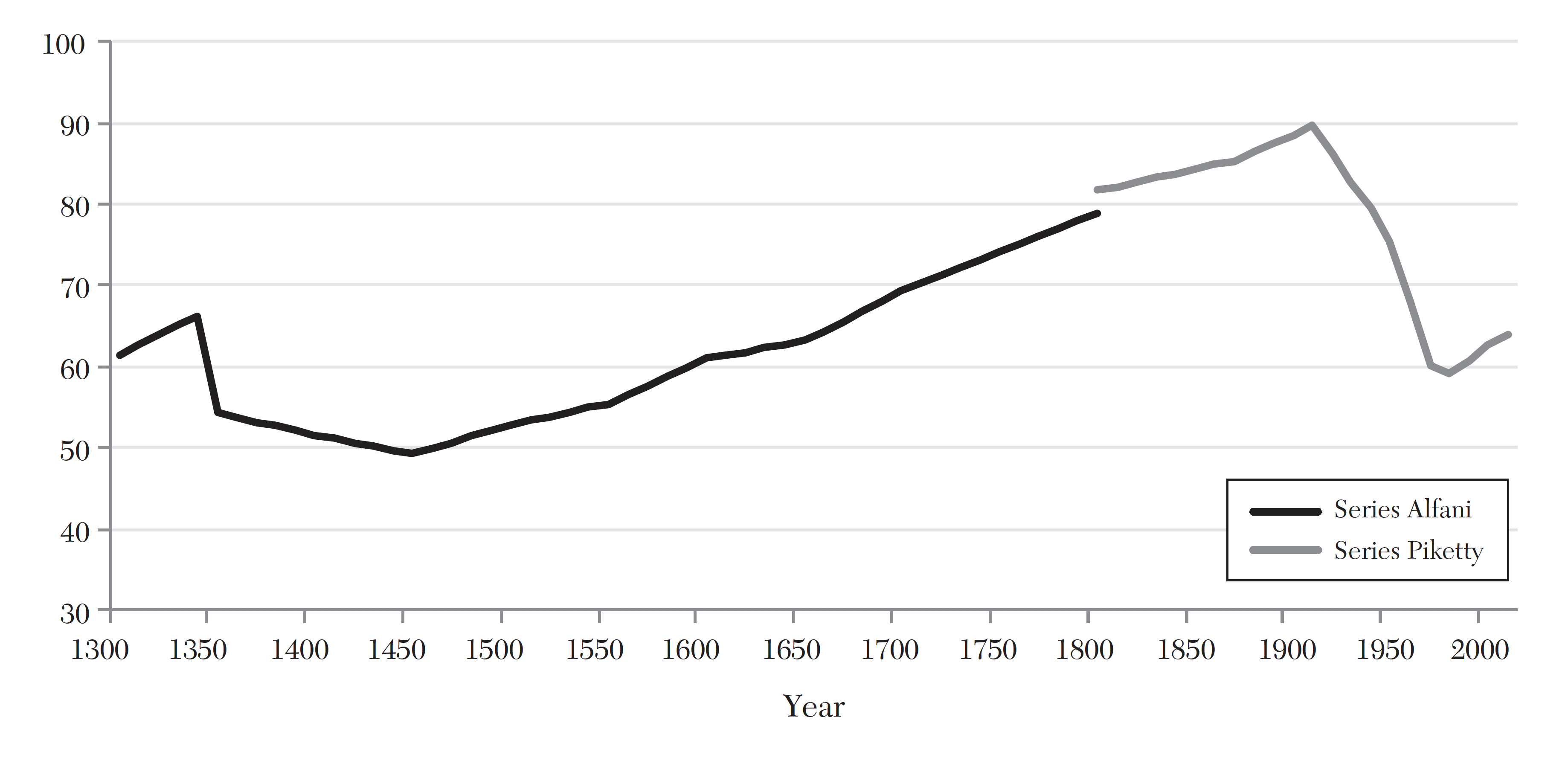 The chart shows the average share of wealth held by the richest 10 percent in two separate regions of Europe. The black line is an average of the Sabaudian State (roughly modern Piedmont, Italy), the Florentine State, the Kingdom of Naples, and the Republic of Venice. The grey line is an average for France, the United Kingdom, and Sweden (sourced from Thomas Piketty’s Capital in the Twenty-First Century).