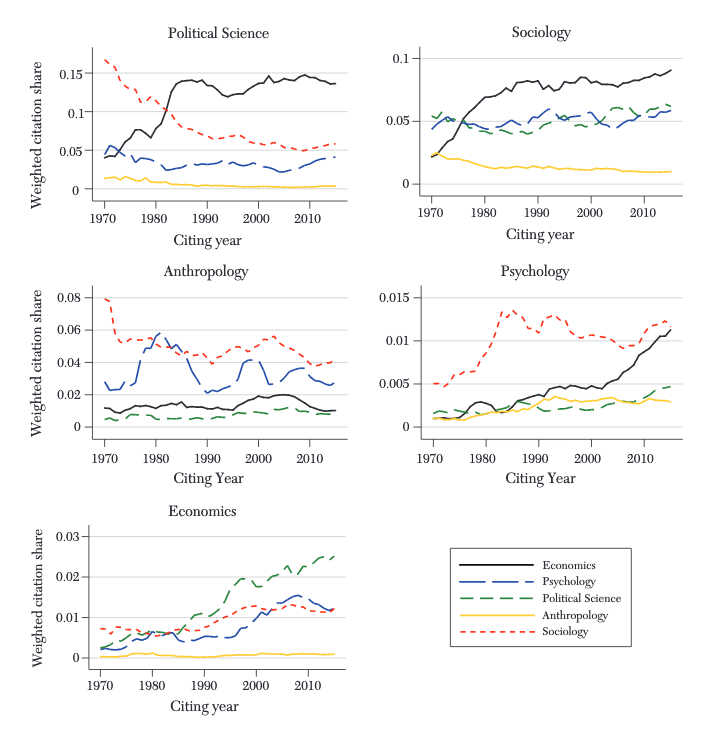 Meanwhile, economics (lower left panel) has grown steadily more attentive to other fields since the mid-1980s. Economists appear to be most interested in political science, though psychology and sociology have also gradually trended upward since 1990. The paper attributes this trend to the rising influence of empirical economics.