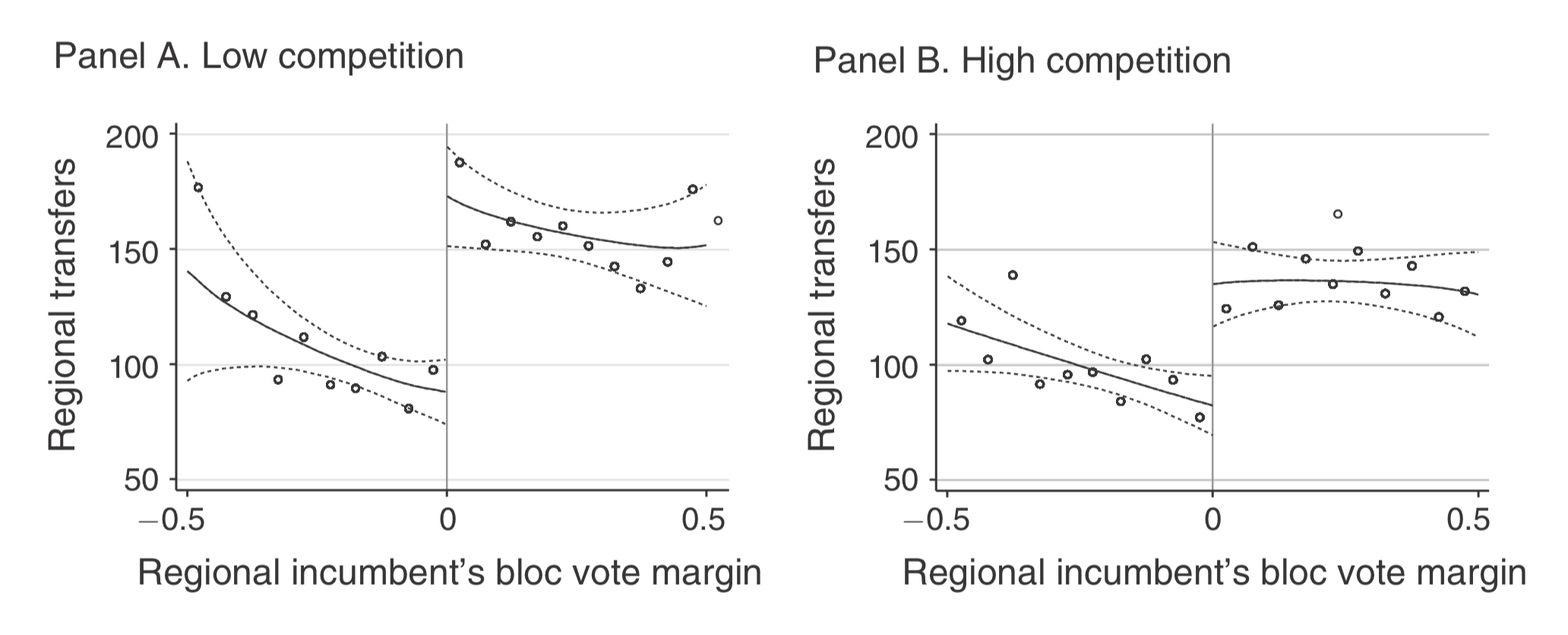 But when incumbent regional presidents face little competition (Panel A), party-aligned municipalities receive about twice what they would’ve received had their regional president been in a tight race (Panel B).