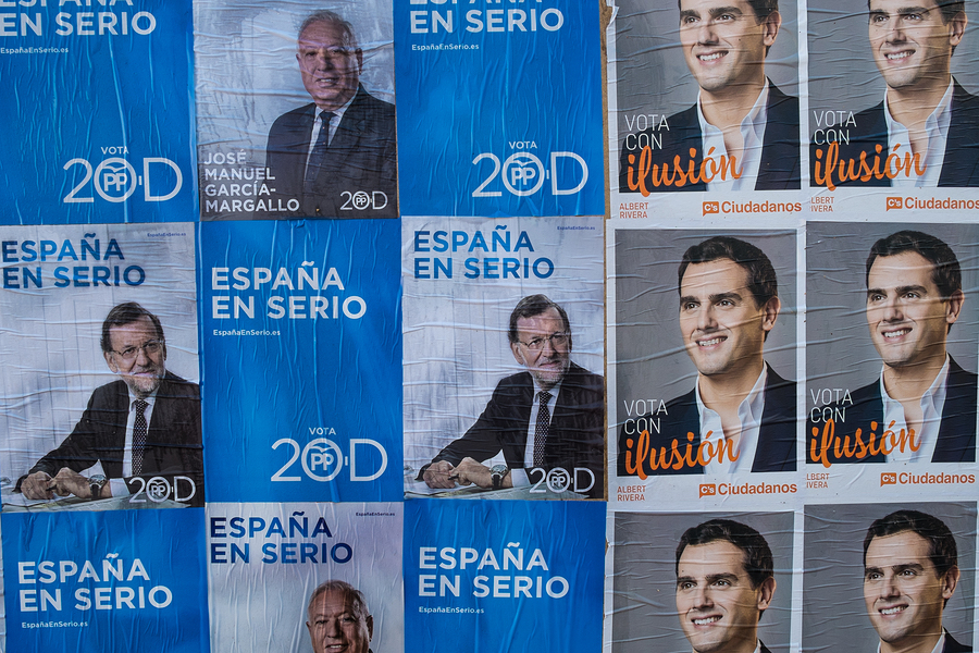Political campaign posters depict former Prime Minister Rajoy and opposition leader Rivera during the 2015 Spanish elections.