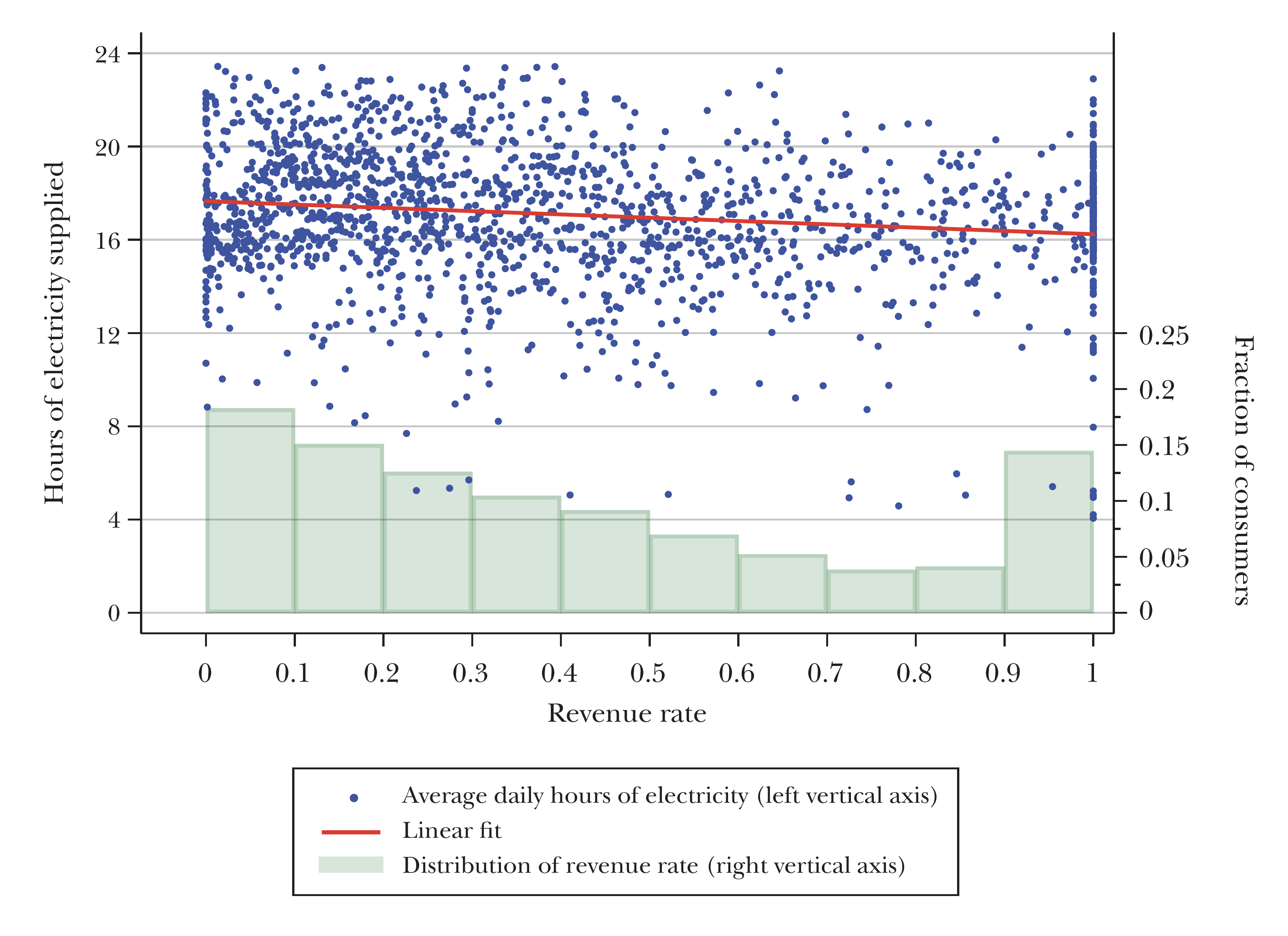 If electricity markets in Bihar were functioning properly the blue dots would not be spread out. They would all be bunched up into the top, right-hand corner. In that case, electricity would be supplied 24-7 and the revenue rate would be close to 1.