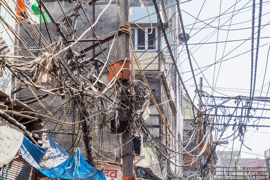 A tangle of power cables hangs from poles in the center of Delhi, India.