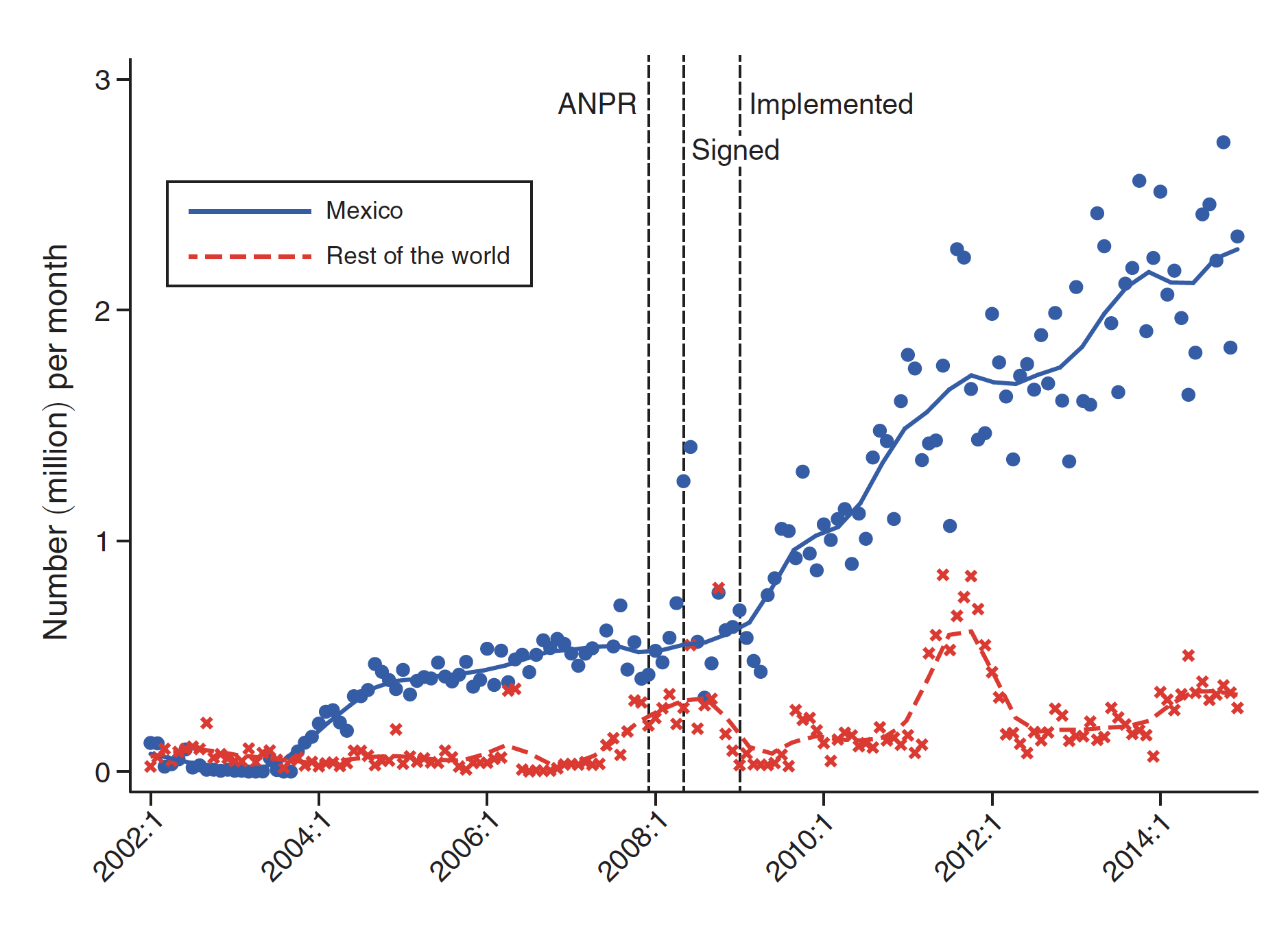 In 2009, the Environmental Protection Agency (EPA) revised its air quality standards for lead, tightening them by a factor of ten. While technologies for reducing lead emissions from battery-recycling plants do exist, the costs are high. As a result, exports of used lead-acid batteries to Mexico surged after the reforms, as seen in Figure 2 from the authors’ paper.