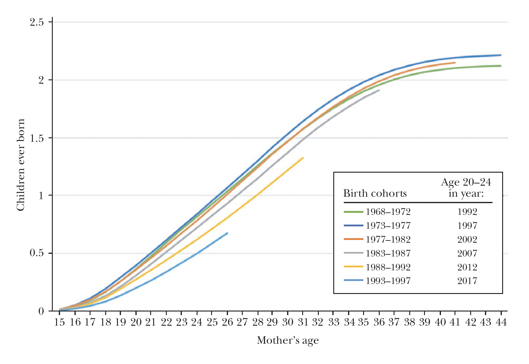 But a marked shift downward started with the cohort of women who entered young adulthood in 2007. And the next two cohorts of women, born between 1988 and 1997, have so far had even fewer children during their prime childbearing years.
