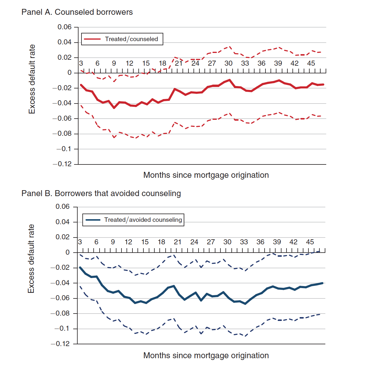 The figure above shows the impact on default rates for the two groups. Though default rates initially declined for both groups, the impacts were stronger for the group that avoided counseling. That group (panel B) simply chose less risky mortgages because doing so allowed them to avoid attending classes. Default rates for the counseled group (panel A) were lower for about a year and a half, but then ticked up again to have virtually no impact after 18 months. And there was no evidence that counseling drove low-FICO borrowers to make different choices. More knowledge didn’t change their appetite for risk.