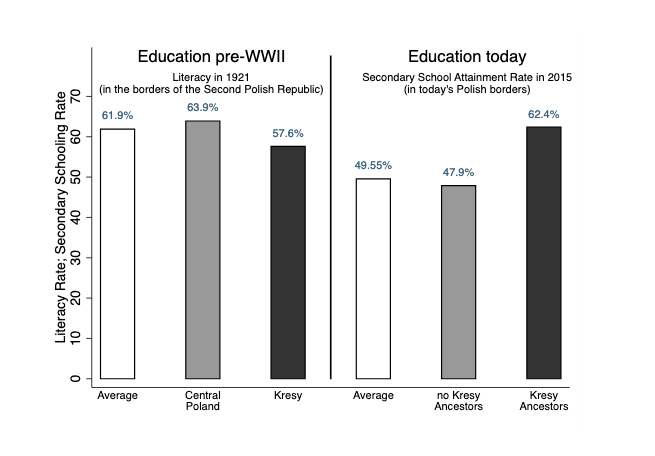 Figure 2 from their paper compares educational levels in Poland before the war to descendants nearly a century later.