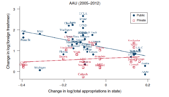 The figure above includes a sample of 60 research universities, charting the log change in foreign first-year students (vertical axis) and the log change in total state appropriations. The trend for public universities (represented by the blue best fit line) shows that steeper funding cuts are correlated with an increased share of entering international students. For private universities (in red), there is no association between the change in the representation of international students and cuts in state funding.