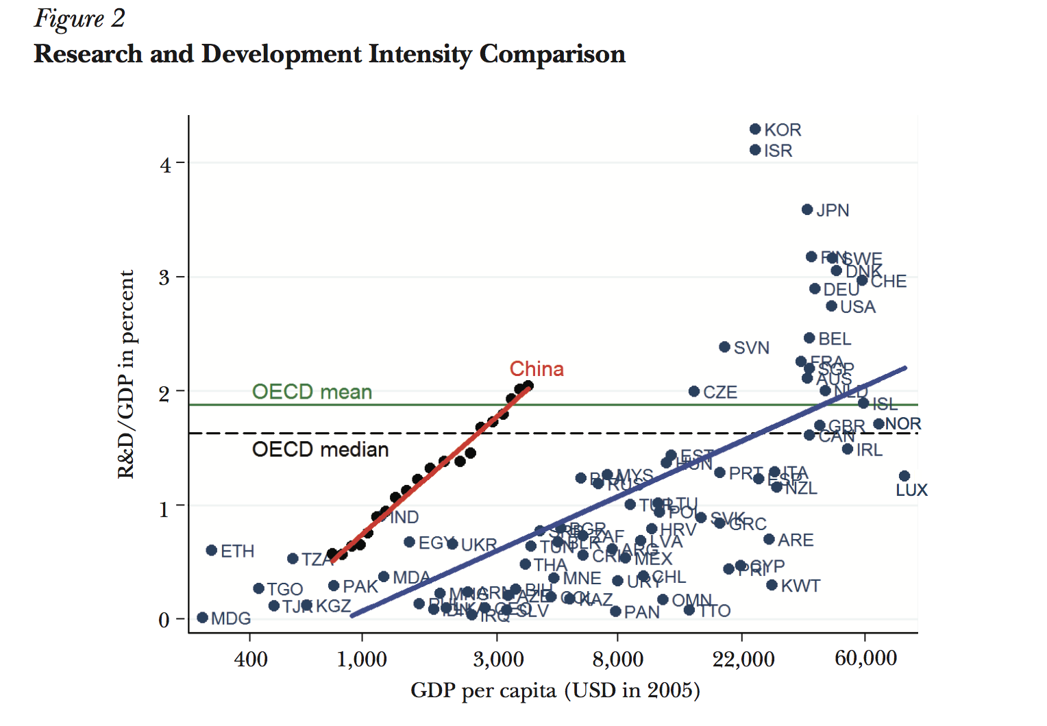 Figure 2 from the paper shows China way ahead of the curve when it comes to R&D spending as a percentage of GDP. Most of China’s middle-income peers like Serbia or Thailand devote less than one percent of output to new innovations, but China’s R&D investments are on par with much richer countries. The authors also find evidence that these investments are paying off, translating into proportionately more patents for Chinese inventors and companies.