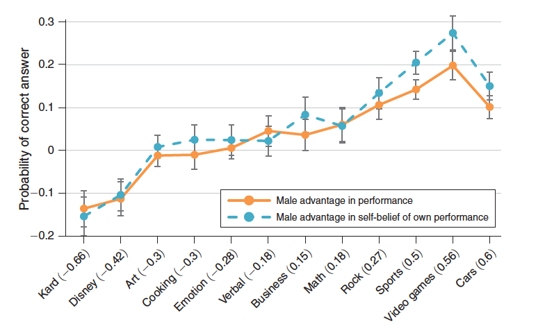 The figure above shows the difference between men and women in how they actually performed on the quiz (the orange line) versus how they believed they performed (teal line). The categories along the x-axis are ordered left to right from most female-typed to most male-typed, which follows the average performance difference between genders.