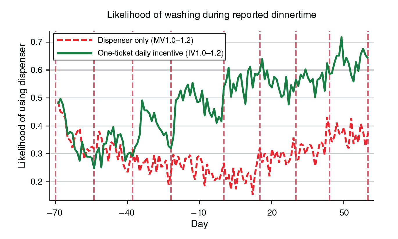 They distributed liquid soap dispensers to households in rural India during wintertime, the peak season for acute respiratory infection caused by the spread of germs. The dispensers had time-stamped sensors to track their behavior. Every two weeks, surveyors visited each home and collected daily performance data. While one group did not know their behavior was being tracked, another group received feedback on their daily behavior and small financial incentives (in the form of tickets they could redeem for household goods) for washing at dinnertime.