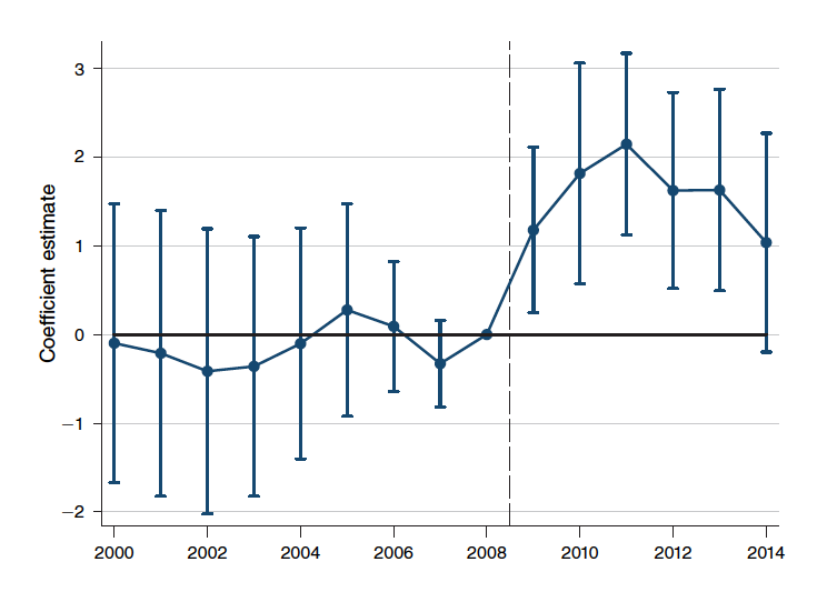 The figure above shows the impact on unemployment from household foreign currency debt exposure. (Error bars represent 95 percent confidence intervals.) Before the financial collapse, there wasn’t much of a relationship. Unemployment seemed little affected by households taking on more foreign debt. But after the depreciation in late 2008, the impact on joblessness rose to 2.3 percentage points in 2011, and unemployment remained persistently higher in more exposed regions for years. By 2014, unemployment in exposed regions had still not returned to precrisis levels.