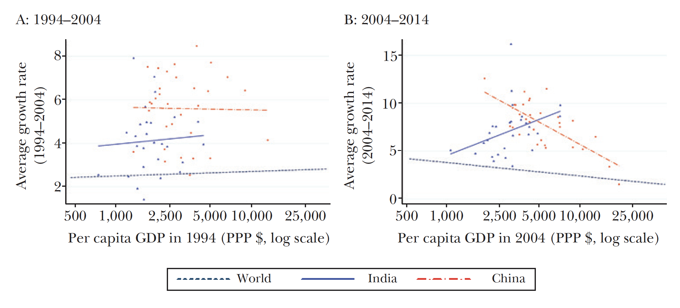 In the chart above, the blue points represent Indian states; the red ones are Chinese provinces. The x-axis in both panels indicates the gross domestic product per person, in purchasing power parity. (Individual countries are not plotted, but they are represented by the short-dashed trend line.) Panel A shows the average growth rates between the years 1994 and 2004, and Panel B breaks this out for the period between 2004 and 2014.