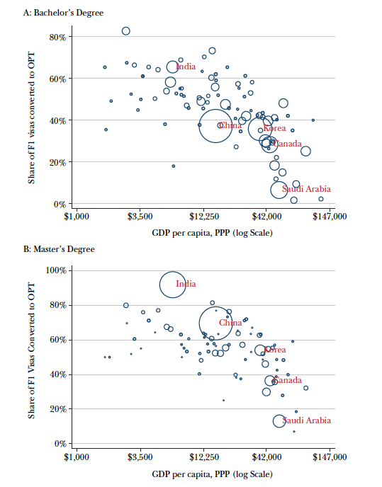 The overall patterns are the same for both degrees. The higher the GDP of the sending country, the less likely it is that a student will stay. For example, the authors point out that about 65 percent of all bachelor’s degree graduates from India switched to OPT, while only 28 percent of Canadian graduates did so. (The size of the bubbles corresponds to the number of foreign graduates from each country.)