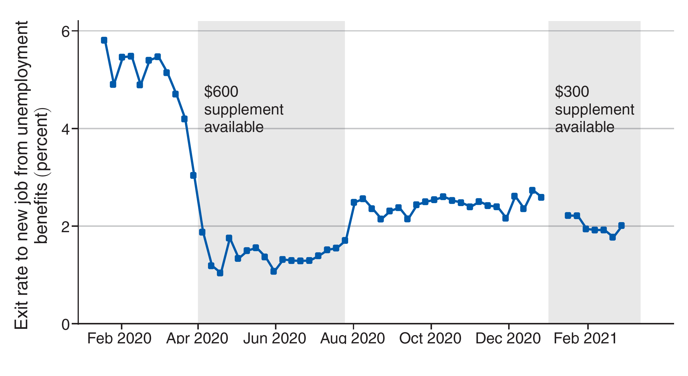At the start of the pandemic, the new job-finding rate dropped by 4 percentage points and remained depressed when the $600 supplements began. After the $600 supplements expired, there was a small increase in the job-finding rate, which was then followed by a small decline when the $300 supplements began.