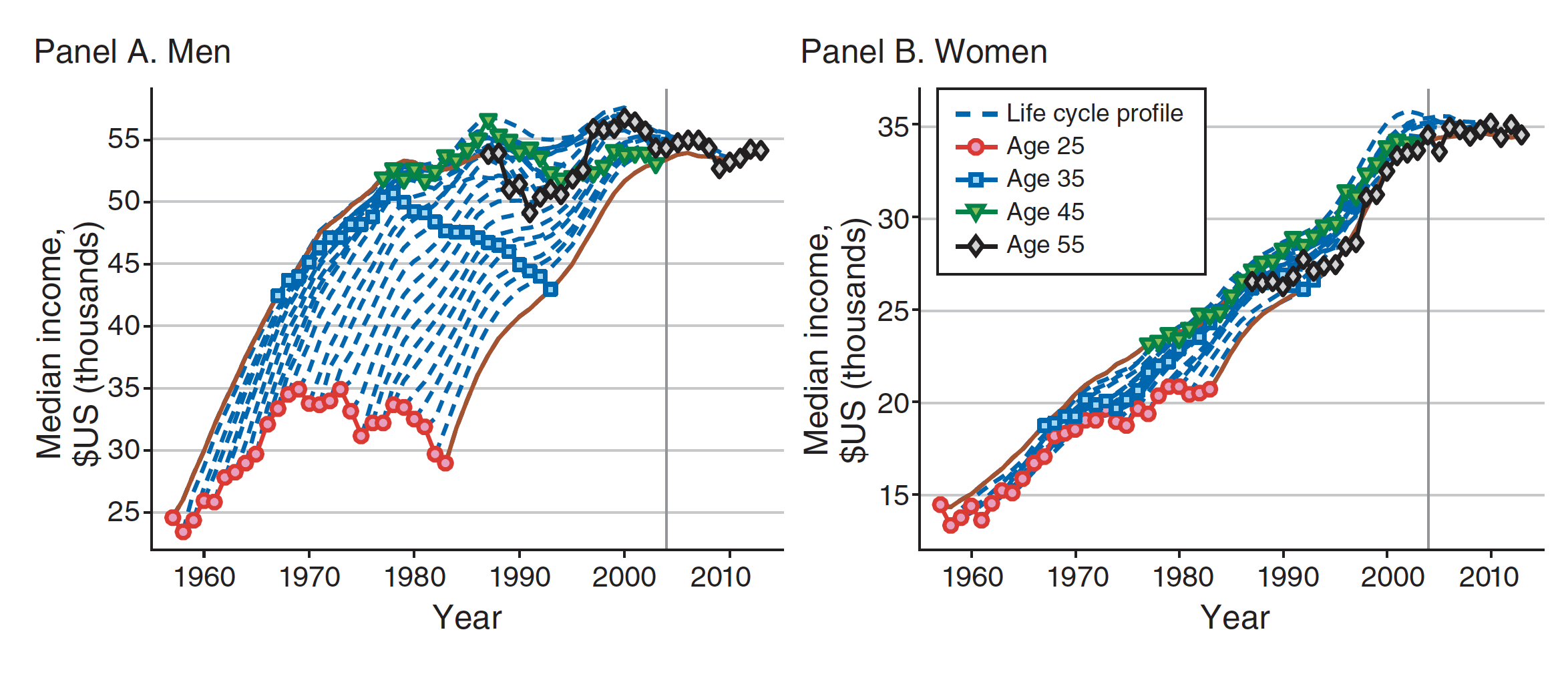 Panel A shows that men’s incomes early in life grew steadily from the 1950s to the 1970s and then declined significantly, despite a growing economy. Men’s incomes later in life hovered between $50,000 and $55,000 over the period. In contrast, Panel B shows that women’s earnings at all ages grew substantially. However, their incomes started at much lower levels.