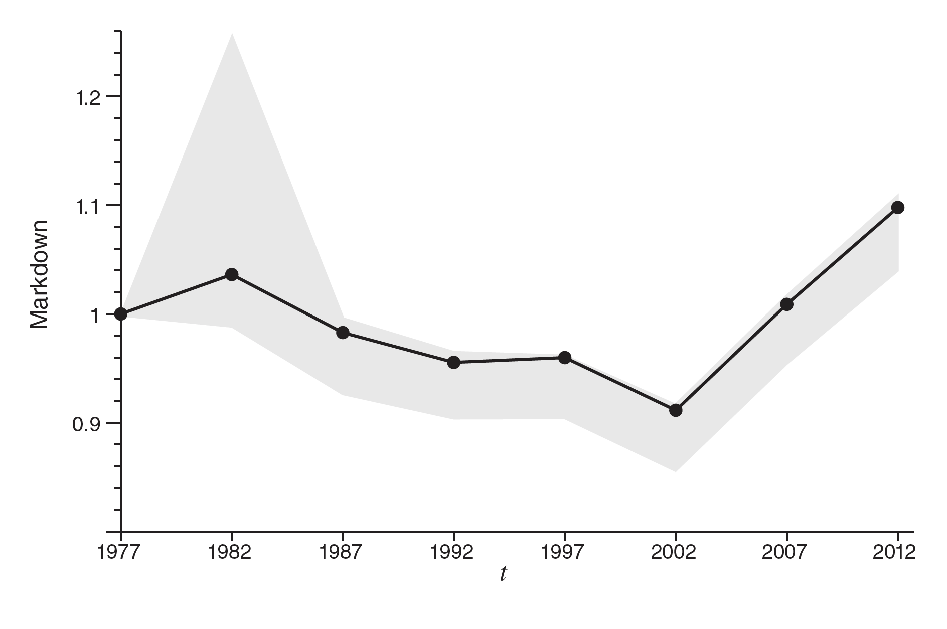 The chart shows aggregate markdowns across US manufacturing plants from 1977 to 2012. The gray band is a 95 percent confidence interval.
