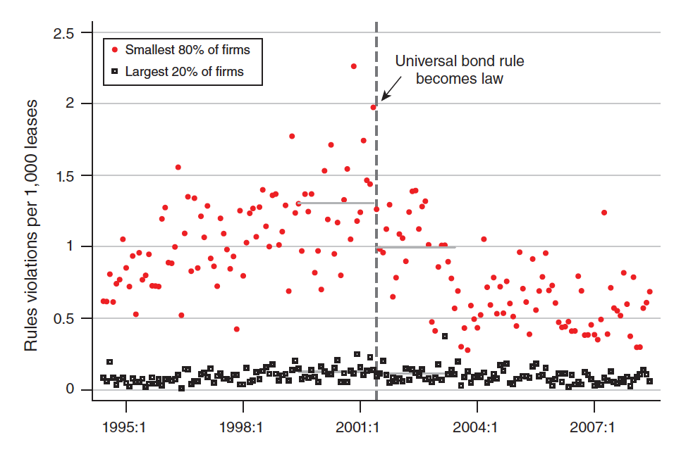 Figure 7 from Boomhower’s paper shows violations of water protection rules before and after the insurance rule was passed in June 2001, marked by the vertical dashed line. The horizontal gray lines are the average number of violations during the two years before and after the policy change. Large drillers (black squares) were unfazed, showing no meaningful shift. But violations committed by small drillers (red dots) declined noticeably after the law went into effect.