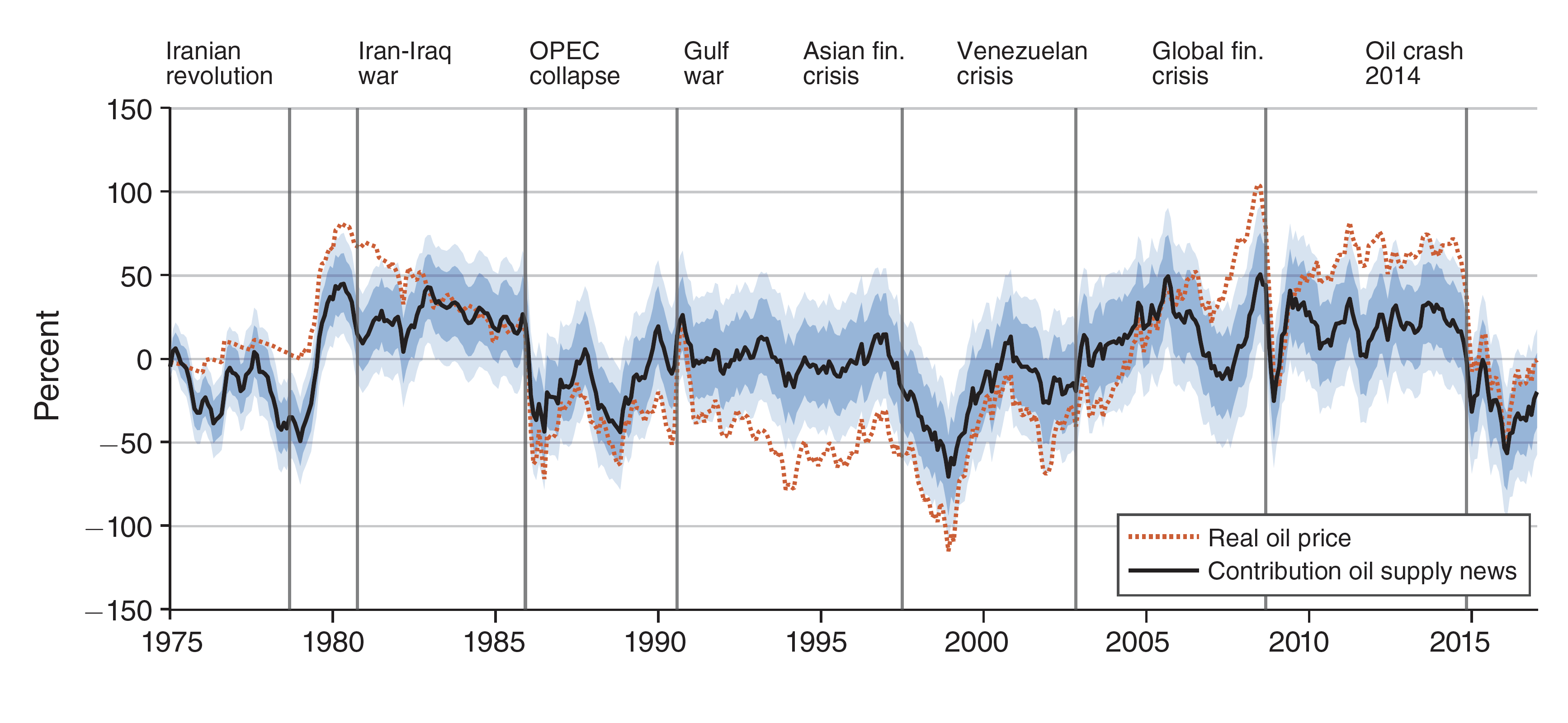 The red dotted line shows the percentage change from the mean of the real price of oil, and the black line is the cumulative historical contribution of oil supply news shocks to the real price of oil. The dark blue bands and light blue bands are 68 and 90 percent confidence intervals, respectively.