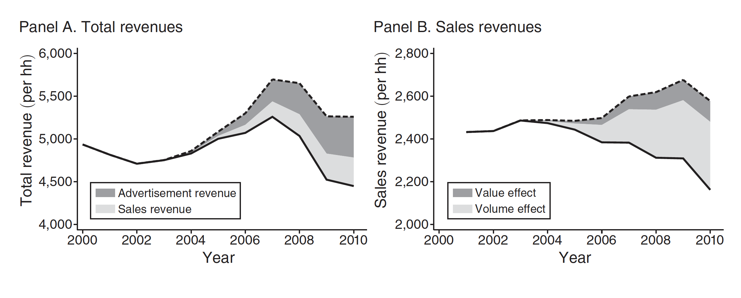 The left panel depicts the actual and counterfactual total revenues for newspapers, along with the estimated losses stemming from lower sales (light gray) and decreased advertising revenue (dark gray). The right panel shows the actual and counterfactual sales revenues over the period, with the difference broken down into predicted losses from the quantity of newspapers sold (light gray) and the price of each copy sold (dark gray).