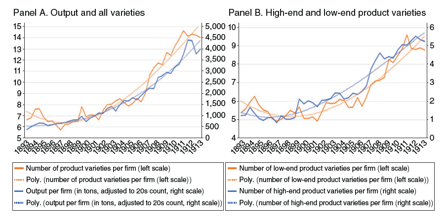Figure 1 shows the relationship between product variety and output at Japanese cotton spinners between 1893 and 1913. Panel A plots the average output at companies (blue line) alongside the number of product varieties (orange line). The dotted lines smooth out the data to show the general trend. The average number of product varieties was mostly flat until about 1899, but then increased after the turn of the century. From then on, product variety and growth tracked each other quite closely, with product variety expansion leading output growth around 1907. Meanwhile, panel B shows that both high- and low-end products increased after a certain point, but high-end variety growth started earlier and maintained a lead over the increase in the number of low-end product varieties.