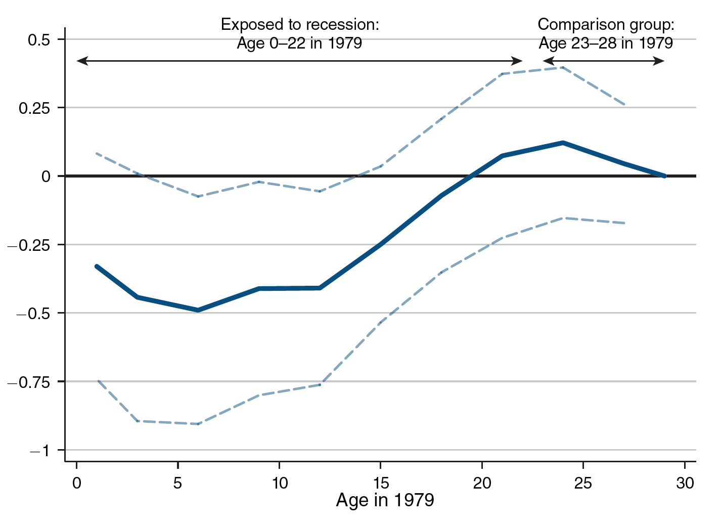 Figure 3 from his paper shows how the recession during the early 1980s affected children’s four-year college degree attainment. The age of each cohort in 1979 is plotted along the x-axis and the effect is along the y-axis. The biggest effects were felt by younger children. For individuals less than 10 years old, a 10 percent decrease in earnings per capita from 1979 to 1982 in their county of birth reduced four-year college degree attainment by 15 percent. A comparison group of people 23–28 years old were barely affected at all, which is not surprising because most people have finished college by age 23.